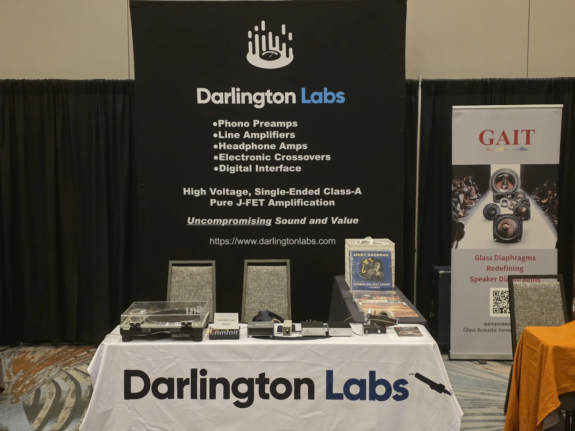 Visit our booth and listen to an MP8B to a Technics SL1200GR2 turntable with a Lyra Delos LOMC driving an Quadratic Audio MC-2 SUT (just released) through a 6AK5 headphone amp (competitor unit) to AKG K701 German-made headphones.